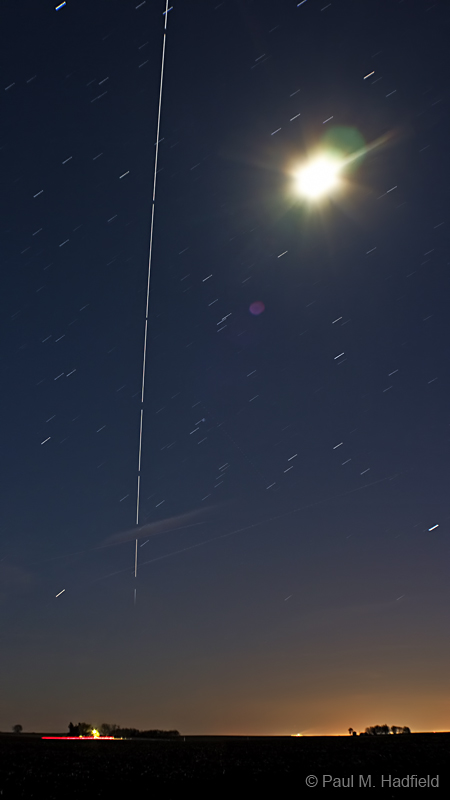 In my second hour long attempt where the moon would eventually slip in frame, I was fortunate to also capture a bright meteor though it was most likely something other than a Leonid for not originating from the radiant or in other words, point of entry.